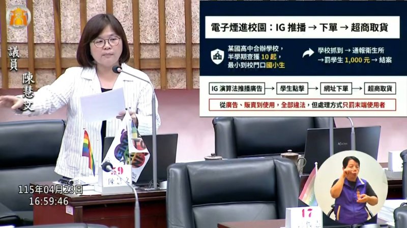 【漾新聞記者陳雯萍/高雄報導】電子煙正沿著社群平台悄悄滲入校園,甚至從高中一路往下蔓延到國中、國小邊緣。高雄市議員陳慧文今(23)日在教育部門質詢時直指,校園電子煙問題已不是零星個案,而是透過Instagram推播廣告、網址下單、超商取貨的完整違法鏈條,卻往往只處罰末端使用的學生,真正推播、販賣與供應者卻難以究責。她要求高雄市政府教育局在3個月內結合衛生局、警察局建立三方聯合平台,並正式行文Meta,開設校園檢舉直通管道,全面攔阻電子煙進入校園。
