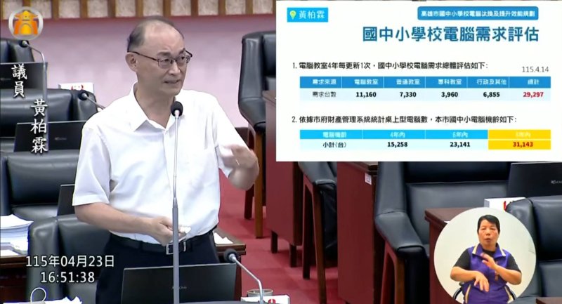 吳立森指出,今年教育局另以租用方式汰換128台設備,並規劃全面升級16GB記憶體以支援AI應用,但因國際市場影響價格上漲,目前仍在招標程序中,後續將依議員建議建立更完整盤點機制。