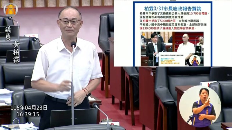黃柏霖最後強調,5,000台大型觸控螢幕一年內完成建置,讓13萬名學生提前受益,原需7至8年才能完成的數位建設大幅縮短,呼籲市府持續推動設備更新與AI應用,並針對已使用5至6年的3,000多台舊設備提出升級方案,確保教育與行政體系同步邁向智慧化。