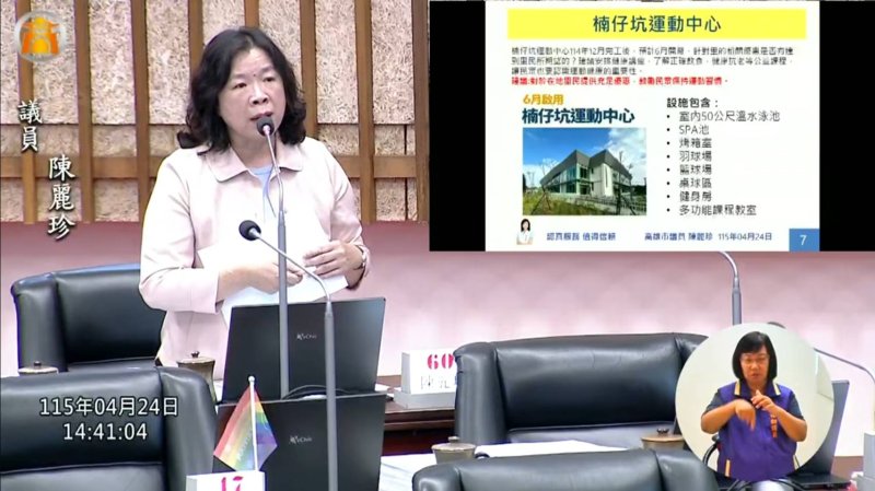 陳麗珍指出,楠仔坑運動中心原預計今年6月啟用,地方十分期待。她要求運動發展局說明是否能如期開幕,並關切社區回饋使用方案,盼在使用者付費原則下,仍能優先鼓勵在地居民運動,給予周邊里民合理優惠,讓公共建設真正服務地方。