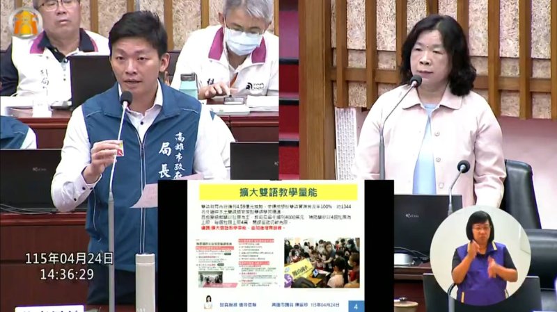 吳立森回應,高雄市目前已聘請250名外籍教學人員及1094名在地雙語師資,並推動「小小雙語」、雙語社團、國際英語行動車及寒暑假英語營隊等措施,其中國際英語行動車已巡迴93校。他表示,將依陳麗珍建議,擴充雙語社團量能,讓資源更主動進入校園。