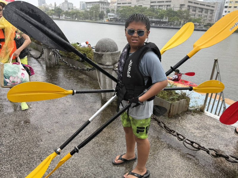 來自烏克蘭的同學,是鹽埕國小的學生,他說,今天是第一次體驗獨木舟,因為方向感不是很好,需要更多的學習與控制。但他說,最喜歡玩的是suv,水上運動真的很好玩。