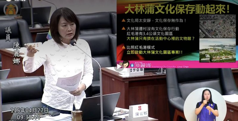 陳麗娜進一步以紅毛港為例指出,紅毛港遷村後仍保留3.4公頃文化園區,並設立基金支持地方文史工作者持續推動文化保存,相較之下,大林蒲遷村計畫中對文化保存著墨有限,預算規模偏低,顯示市府對不同區域文化保存投入存在明顯落差。