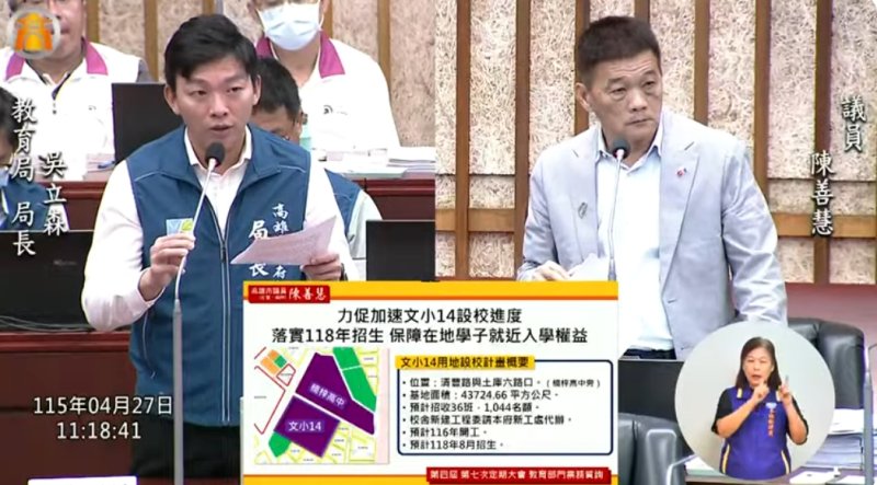 教育議題方面,陳善慧關心文小14設校進度,要求教育局確保118年招生。他並建議因應楠梓產業發展需求,積極規劃兩歲專班,補足托育量能。教育局長吳立森表示,相關設校與幼教資源配置均持續依人口成長與區域需求評估推動,將朝如期招生目標努力。
