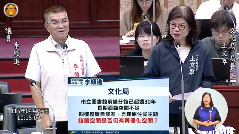 【漾新聞記者陳雯萍/高雄報導】高雄市議會教育部門質詢中,高雄市議員李順進針對前鎮圖書分館使用空間提出質疑,認為現有設施雖持續優化,但整體空間已顯擁擠,建議文化局應重新檢討配置,研議擴大或調整空間,讓圖書館功能更貼近市民需求,進一步提升文化服務品質。
