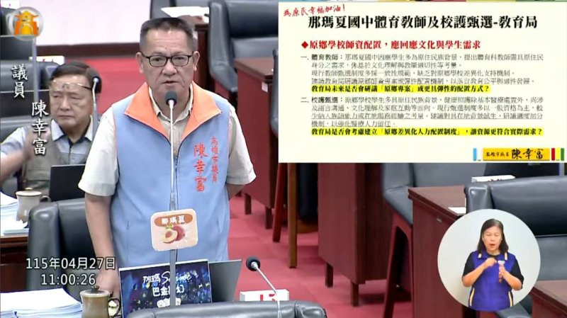 針對巴楠花實驗高中高中部設立,陳幸富要求教育局協助師資、課程與升學就業銜接。吳立森表示,巴楠花實驗高中高中部已於去年5月6日通過設立,115學年度下半年開始辦理,首年預計招生15人,課程將符合課綱,同時著重傳統記憶文化保存,並兼顧升學與就業輔導。
