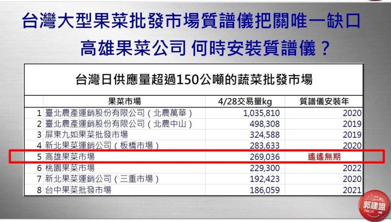 郭建盟表示,質譜儀可更精準檢測農藥殘留,不只是防堵問題蔬果,也能協助農民提升生產管理水準。他指出,鳳山果菜市場已執行相關檢驗機制,成效良好,高雄果菜市場作為全國重要批發市場,更應積極跟進,不能因成本或自籌款壓力停滯不前。