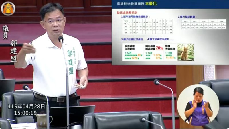 郭建盟也指出,目前動保處官網不易找到1959動物救援通報資訊,民眾若遇到受傷犬貓,第一時間常不知道該從哪裡通報。他要求動保處應在官網首頁明確設置「動物救援通報」專區,讓1959專線與相關通報流程一目了然,避免關鍵時間流失。