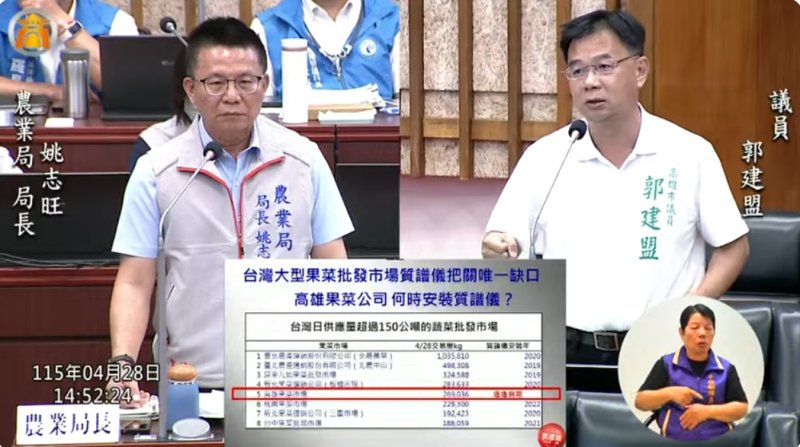 除動物救援外,郭建盟也關注果菜市場農藥檢驗升級。他質詢高雄市政府農業局長姚志旺指出,全國每日蔬菜供應量150噸以上的重要果菜批發市場,多數已導入質譜儀等精準檢驗設備,高雄果菜市場卻仍未普及,恐成為大型市場中農產品安全檢驗的缺口。