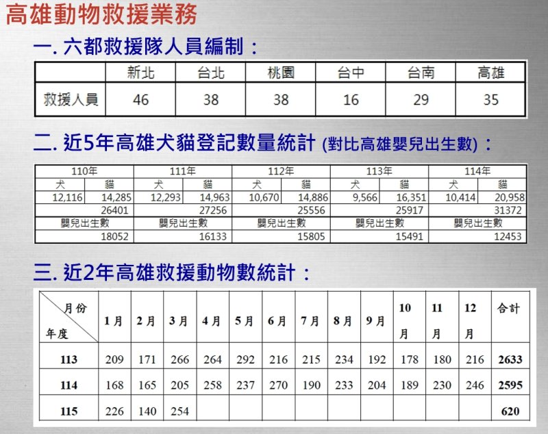 郭建盟質詢高雄市政府動物保護處長許銘彰指出,目前高雄動物救援體系高度仰賴委外運作,救援隊分駐鳳山與燕巢共6個分隊,總人力約35人,其中實際負責1959專線調度與救援的核心人力僅約10人,日間由委外人員執勤,深夜時段則仰賴消防局支援,形成「日間委外、夜間借力」的運作模式。
