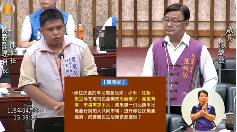 【漾新聞記者陳雯萍/高雄報導】高雄市議會今天(4/28)下午繼續進行農林部門質詢,原民議員范織欽聚焦茂林區災後治水、部落用水與原鄉農產出路,從工程安全到產業尊嚴連番追問,要求高雄市政府水利局、自來水公司與農業局加速處理,讓山區部落不只在颱風季前獲得防災保障,也能讓小米、紅米、樹豆等特色作物走出穩定市場。