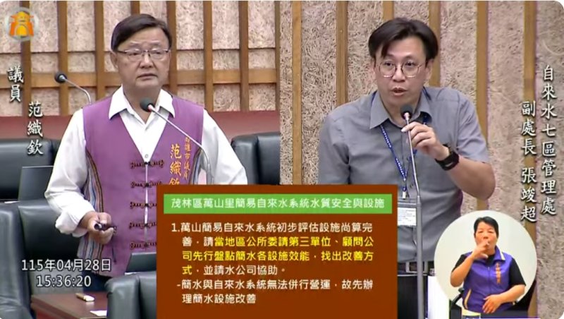 針對茂林用水問題,范織欽出示水源枯竭照片,直言部落居民一到缺水時就苦不堪言,甚至連日常盥洗與如廁都受影響。他要求自來水公司第七區管理處說明短中長期方案,不能讓部落長期仰賴消防隊送水應急。