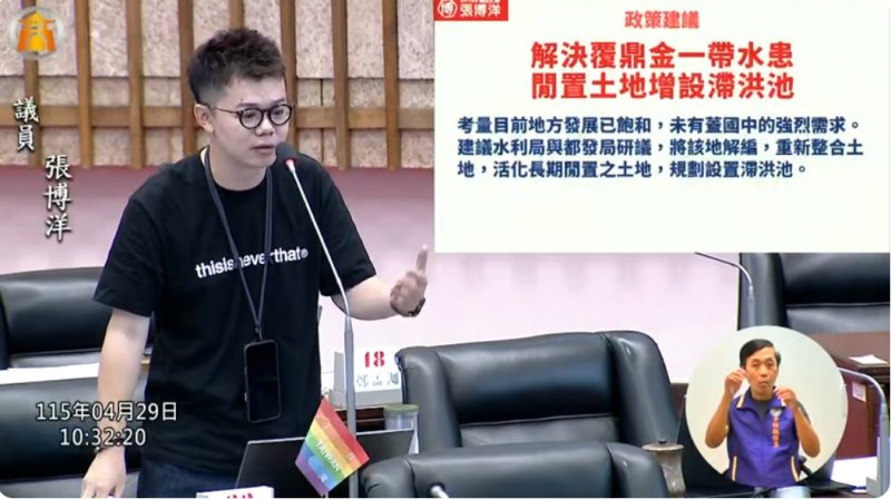 【漾新聞記者陳雯萍/高雄報導】汛期將至,高雄市三民區本和里防洪議題再度浮上檯面,高雄市議員張博洋於農林部門質詢中指出,極端氣候已成常態,地方治水不能再停留於被動應對,應提前部署長期滯洪設施,強化整體排水韌性,並建議盤點軍備局土地,評估設置滯洪池的可行性。