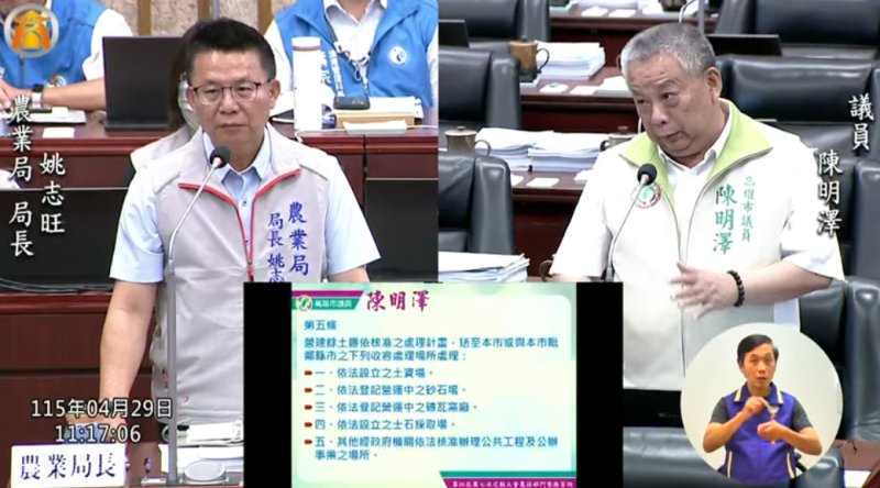 【漾新聞記者陳雯萍/高雄報導】農地整地審查制度是否過於僵化,成為農業發展的隱形門檻?高雄市議會農林部門質詢中,市議員陳明澤直指現行農地整地審查作業規範中,對於土方來源的限制過於嚴格,不僅與實務需求脫節,更可能影響農地利用效率與整體農業政策推動,要求市府檢討並修正相關規定。