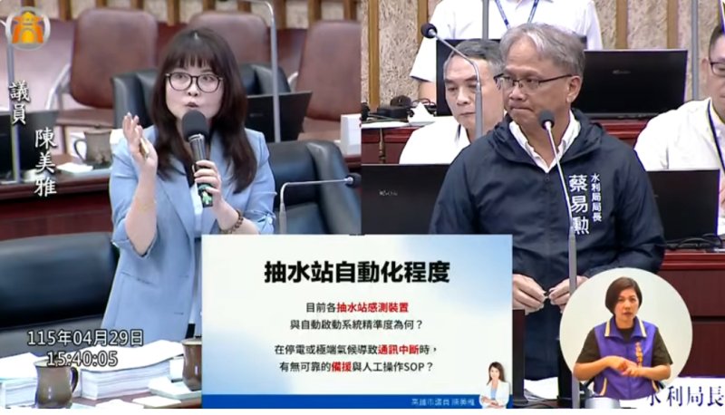 針對抽水站自動化及停電備援機制,陳美雅質疑,高雄過去曾發生抽水站設備異常或操作問題,水利局不能只說「都有備援」,而應提出各抽水站感測裝置、自動啟動系統及人工操作機制的精準度與檢核結果,確保極端氣候下不會再出現防汛漏洞。