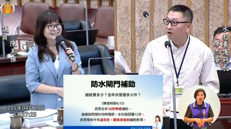 陳美雅指出,高雄每年汛期來臨前,防水閘門都是許多低窪地區住戶的重要防線,市府既然鼓勵民眾申請補助,就應讓流程更透明。她追問防水閘門補助總經費、去年受理金額及目前撥款狀況,並舉例有民眾去年10月申請補助,至今年4月仍未收到款項,質疑水利局審核與撥款效率不佳。