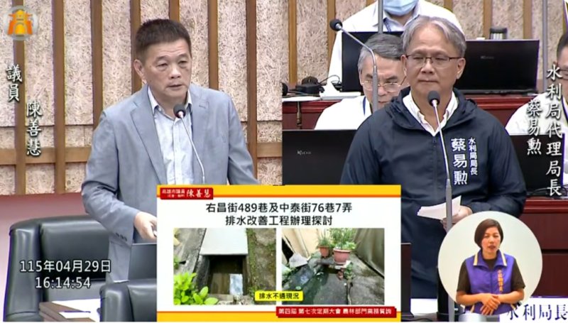陳善慧並建議,排水改善應同步整合公園修繕、人行道改善及老舊設施更新,處理樹根竄入水溝、人行空間破損等問題,不能只做單點工程,應一次提升整體生活環境。他也要求水利局持續推動後勁溪水岸環境改善,並協同經發局楠梓產業園區放流管工程,兼顧排水安全與水岸景觀品質。