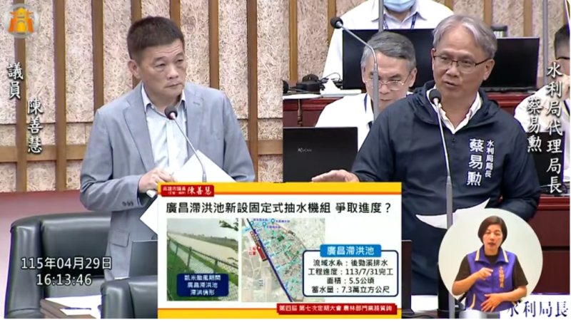 針對右昌地區防洪,陳善慧關心美昌抽水站擴建進度及廣昌滯洪池新設固定式抽水機組爭取情形。他指出,廣昌滯洪池面積5.5公頃、蓄水量7.3萬立方公尺,已於113年7月31日完工,但面對極端降雨,仍需進一步強化抽排能力,提升後勁溪排水系統韌性。