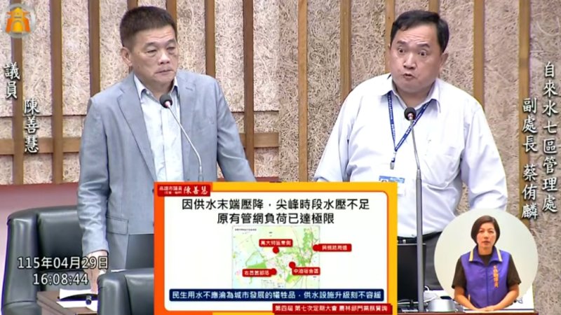 自來水公司第七區管理處副處長蔡侑麟答詢表示,楠梓近年發展快速,供水需求確實增加,自來水公司已針對部分供水末端與水壓不足區域進行盤點,後續將配合管線汰換與管徑擴大,改善尖峰時段水壓不穩問題,並強化漏水點搶修效率。
