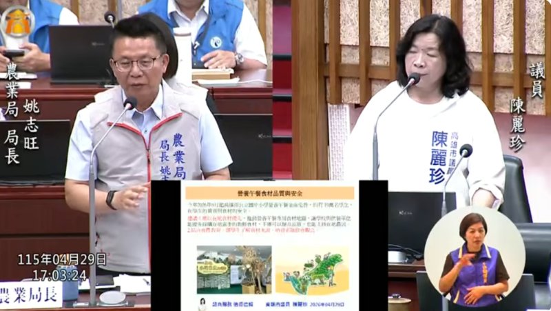 在農政議題上,陳麗珍聚焦9月起國中、國小免費營養午餐政策,強調應優先使用高雄在地食材,並點出蔬菜供應恐不足問題。她建議建立「季節食材地圖」,讓學校掌握供應量與價格,避免行政執行卡關。