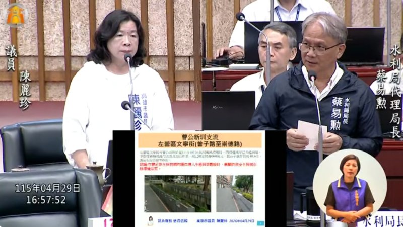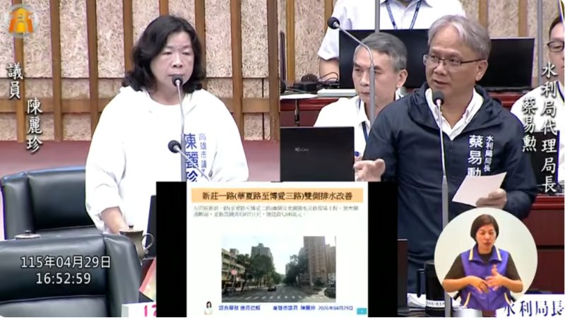 同場質詢中,陳麗珍將焦點轉向曹公新圳支流(左營區文寧街曾子路至崇德路)淹水問題,指出113年大雨期間因擋水牆破損呈現「凹洞式破口」,導致水流外溢淹入住家與原生植物園。她強調,該區已投入約500萬元整治園區環境,若未同步強化防洪設施,將前功盡棄,建議兩側全面設置擋水牆並兼顧美觀設計。