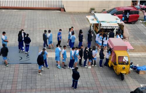 【漾新聞記者陳雯萍/高雄報導】今天是學期末的最後一天,也就是所謂的休業式,高雄市鳳西國中不讓學生們閒閒沒事件,特別規劃《雙數食尚小市集》,不僅請來12家創意特色餐車到校,也規劃了「雙語」與「數位」的闖關活動,一旦闖關完成,就可以憑票到攤位前兌換自己最愛的美食,有雞蛋糕、寒天檸檬愛玉、小時候小鳥蛋的煎鳥蛋、伊豆燒烤、拷我麻吉、板煎吐司…等等,都是小朋友最愛的美食,也難過各個攤位前都大排長龍,而美食在前,闖關的辛苦拋在腦後,同學們都說,超開心!