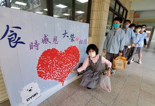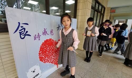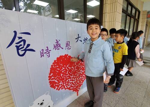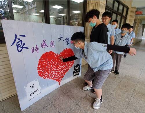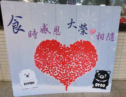 為了辦好這次的食物「一日捐」,大榮中學家長會在總會長林至佳與國中部會長黎懿珍、國小部會長陳惠嫥的帶領下,也製作了一個「食時感恩 大榮愛相隨」的看板。