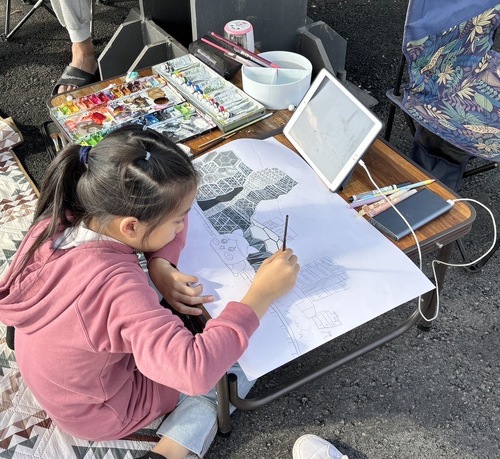 天氣晴朗,吸引許多家庭攜帶畫板、帳篷、野餐墊、野餐椅,悠閒地在港灣邊創作,孩子們全神貫注地描繪畫面,家長們則陪伴左右,共享親子時光,場面溫馨和樂。