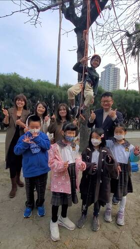 善於利用外部資源,借力使力,校長盧昰余今天也藉由大手攜小手的合作模式,特別邀請兩所大學的教授、大學生前來,除了全程進行雙語的開學典禮,也由實踐大學高雄校區教務長,也是休閒產業管理系主任林保源副教授,帶著已經領有「攀樹」證照的大學生,前來指導學生們如何安全的「攀樹」。