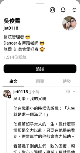 【漾新聞記者陳雯萍/高雄報導】高雄骨科權威吳明峯因流感併發心肌梗塞驟逝,享壽62歲。這突如其來的噩耗讓醫界與無數病患震驚與不捨。他以醫者仁心懸壺濟世數十年,無怨無悔地奉獻自己,甚至燃燒生命守護病人,直到最後一刻。今(15)日,他的長子吳俊霆在社群媒體發文悼念父親,形容他是「真實世界的鋼鐵人」,以無私的精神將生命幻化為愛,也誓言將完成父親的醫療志業,延續他的理想與精神。