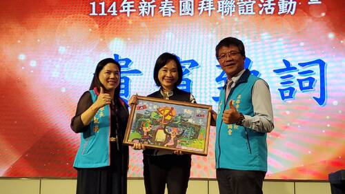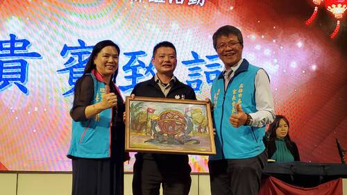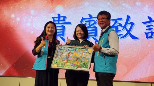 圖/蔡淑娟(右)致贈紀念禮物給高雄市各級學校家長會長協會第16屆理事長張簡智鵬(左),中為教育局長吳立森。(記者陳雯萍攝)
